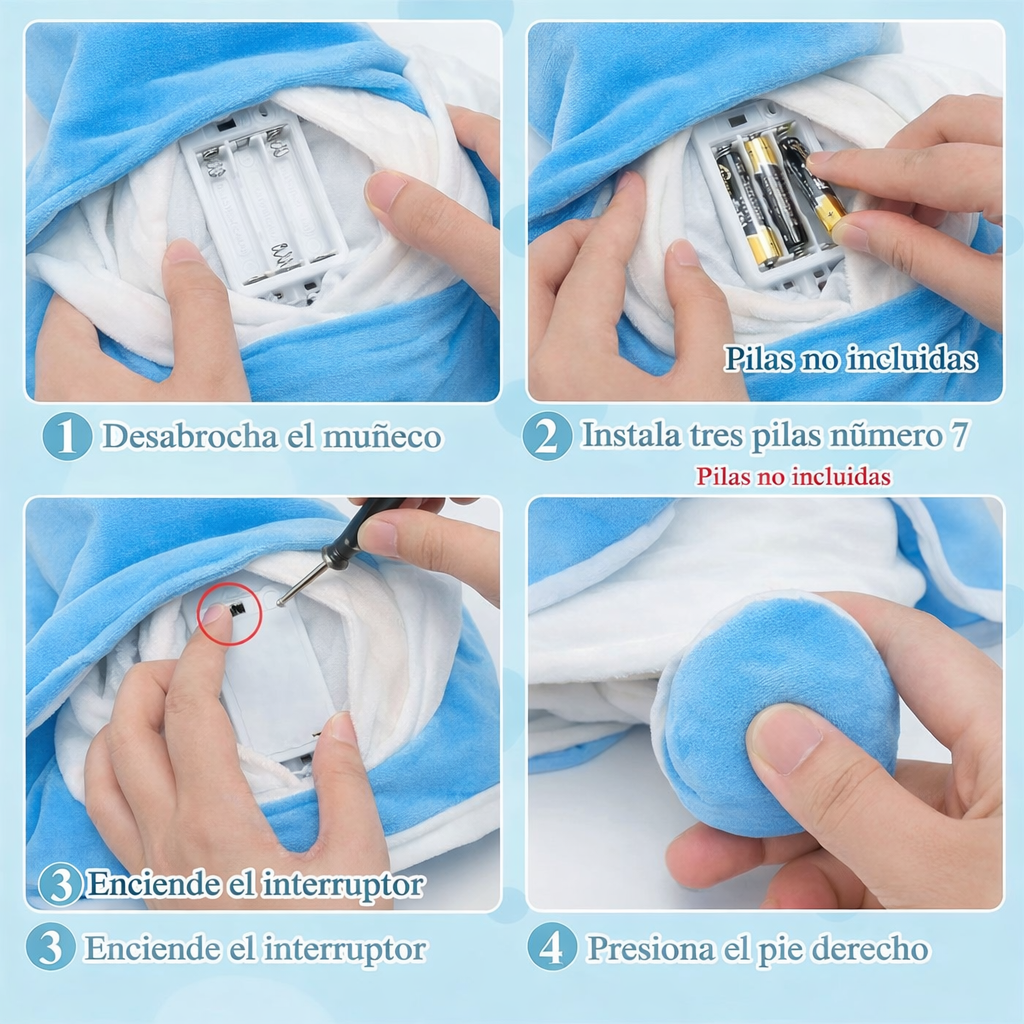 Funciona con pilas AAA y se activa fácilmente desde el interruptor oculto, haciendo que cobre vida en segundos. Ideal como regalo especial, elemento decorativo o compañera reconfortante, es perfecta para quienes buscan algo diferente, mágico y lleno de encanto.